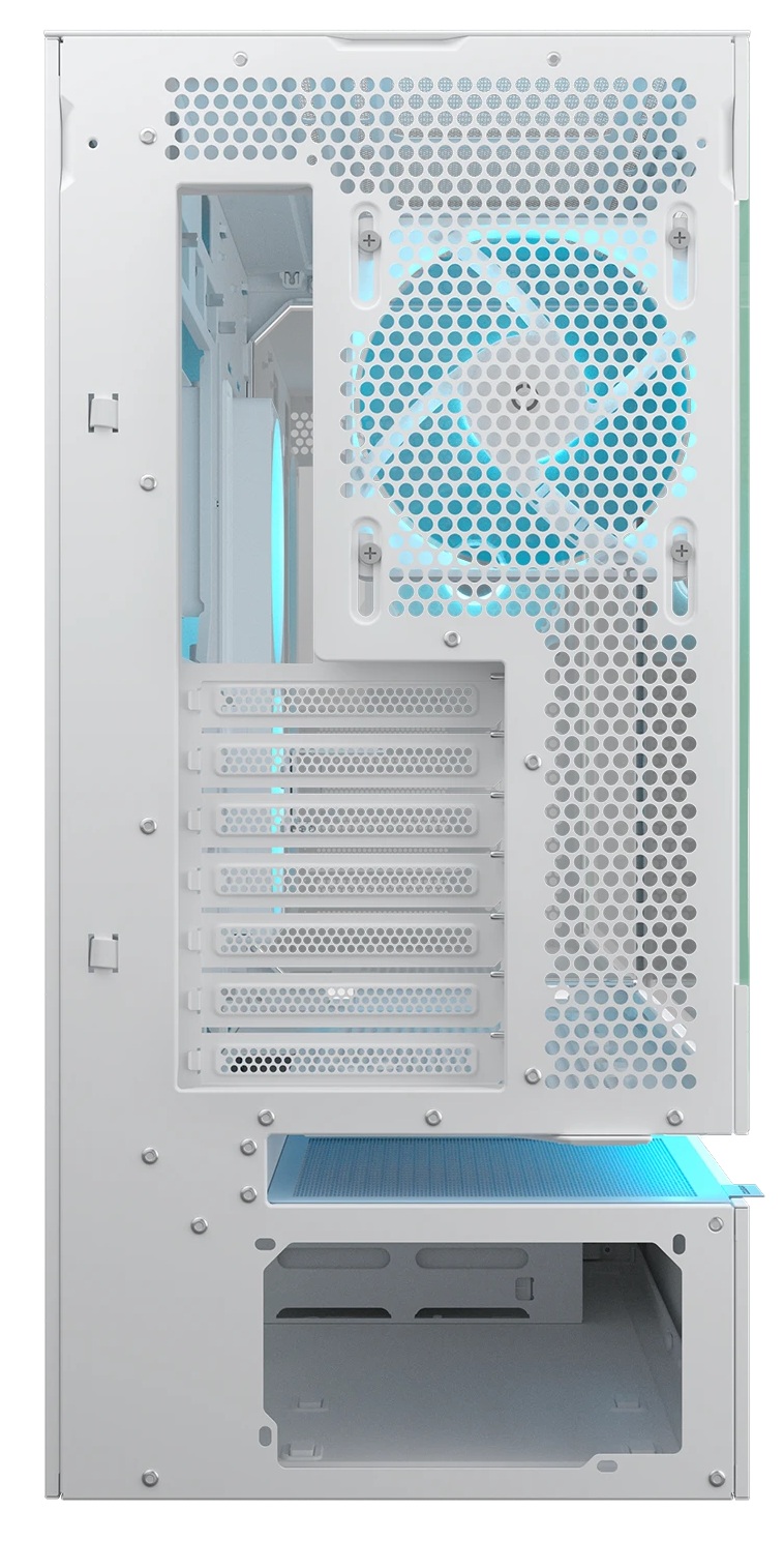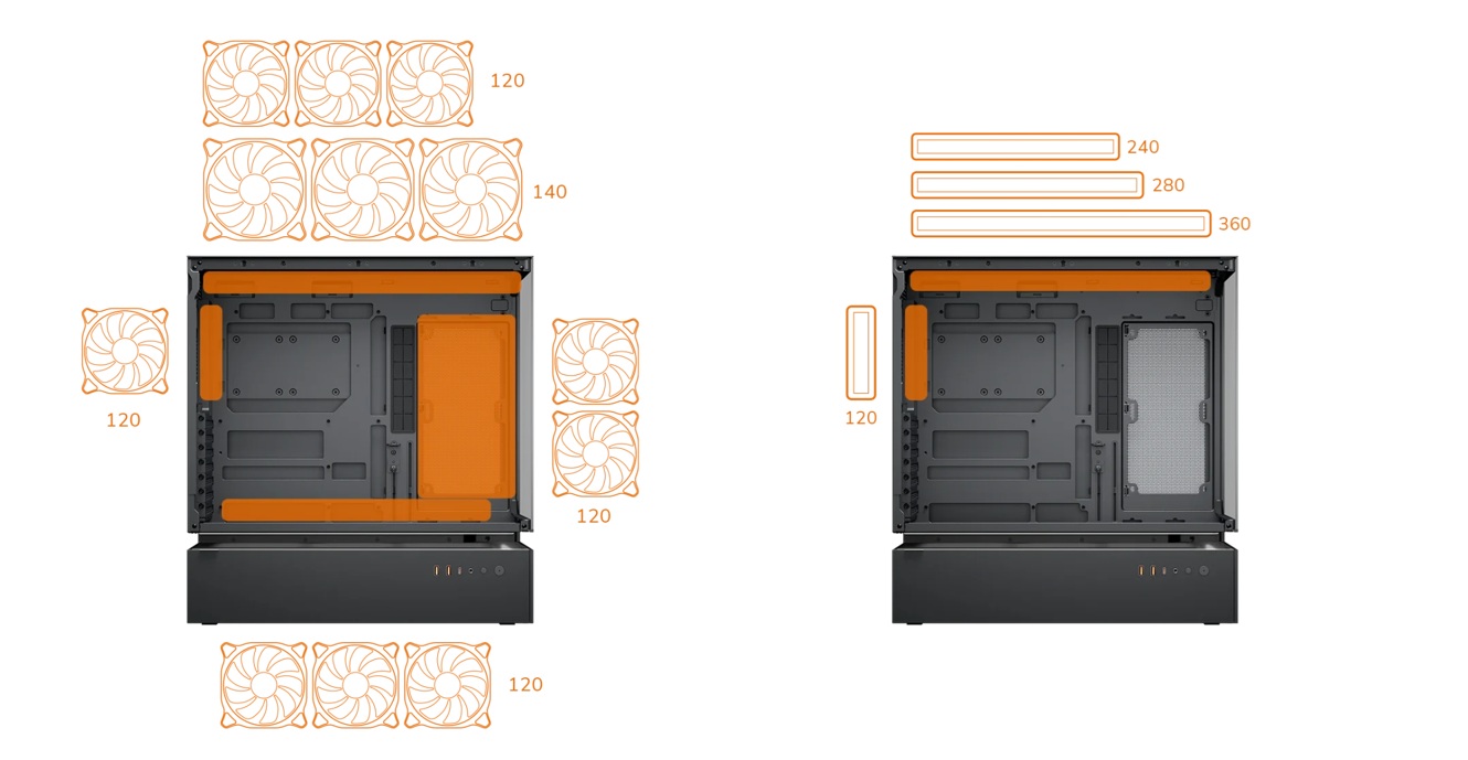 CFV235 levereras med två, eller tre beroende på hur vi ser på det, förinstallerade fläktar: en Unity 240 (2×120 i en ram) ARGB PWM reverse-blade fläkt på moderkortssidan och en 120 millimeters ARGB PWM-fläkt i bakre delen. Totalt kan chassit husera upp till nio fläktar (3×120/140 millimeter i toppen, 3×120 millimeter i botten, 2×120 millimeter vid moderkortssidan och 1×120 millimeter i bakre delen). För vattenkylning stöds radiatorer upp till 360 millimeter i toppen och 120 millimeter i bakre delen, vilket gör det möjligt att bygga avancerade kylsystem med hög flexibilitet samtidigt som vi förvånas över den låga ljudnivå som hålls då chassit inte kommer med något extra ljuddämpning.