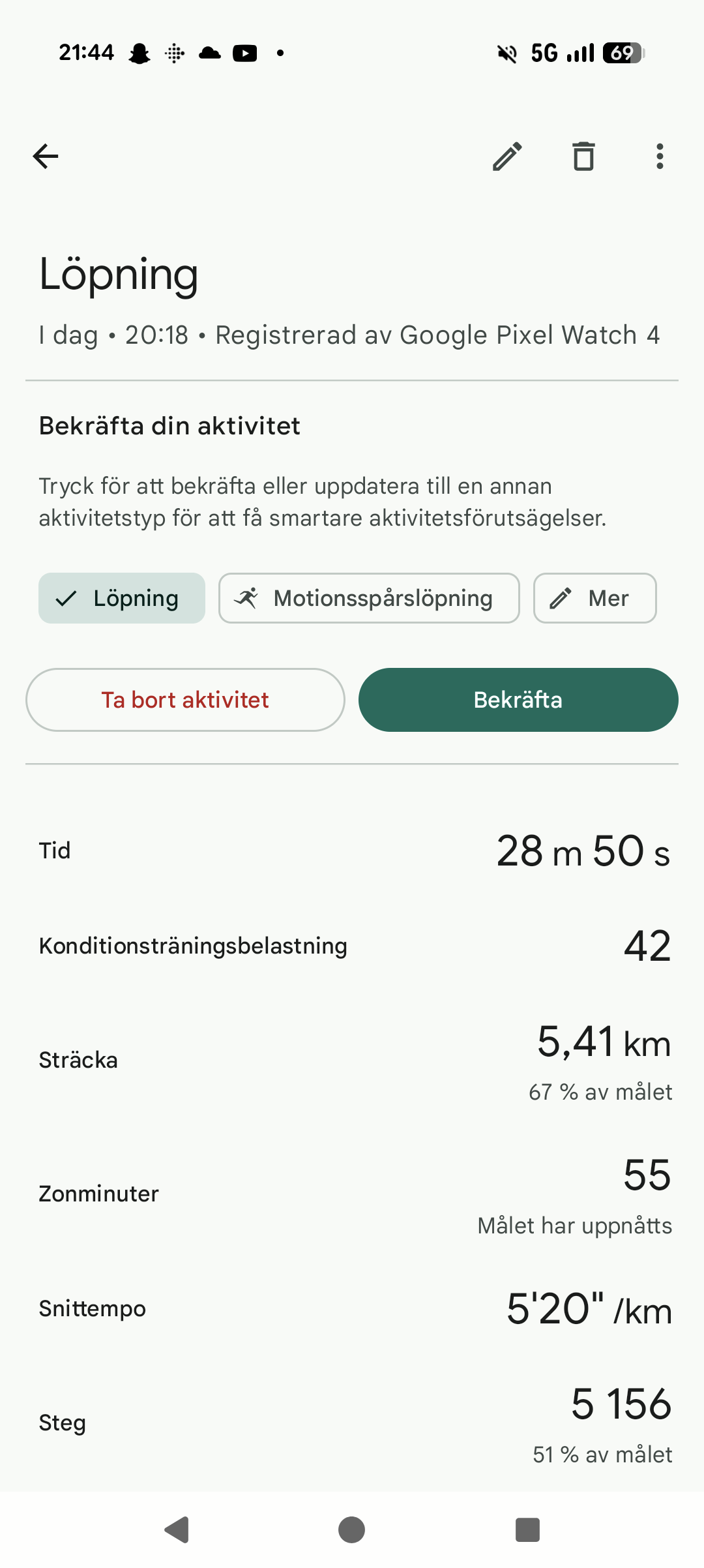 När vi ändå pratar om löpning har Pixel Watch 4 GPS-hanteringen förbättrats med dual-frequency GNSS (L1+L5), vilket ska ge mer exakt positionering i stadsmiljöer och skog. Våra tester visar att rutterna är stabila men ibland något vingliga jämfört med vissa andra toppmodeller, även om precisionen generellt är god. Detta innebär bland annat att om vi springer på en skogsväg som ligger nära en annan väg kan rutten ”hoppa” lite mellan dessa båda. Likaså märks att avståndet på exakt samma löprunda kan variera mer än bara några snedsteg, vilket troligen beror på just denna variation.
