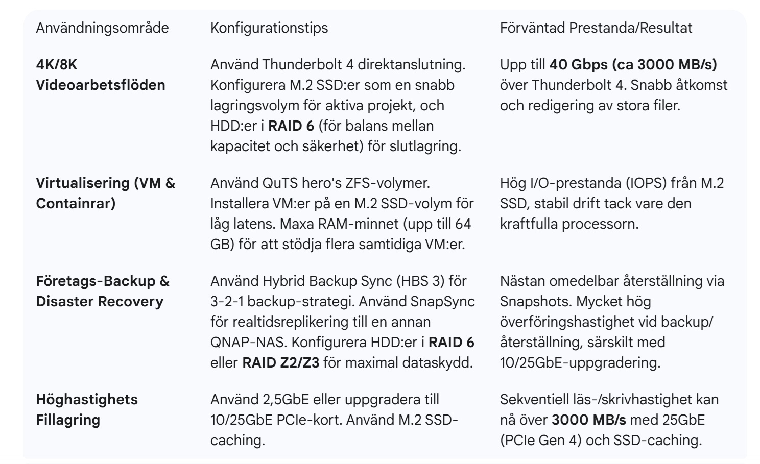 - Videoproduktion: SSD-volymer för pågående projekt, HDD-pooler för arkivplacering och gärna en 25 gigabitsanslutning för redigeringskluster.