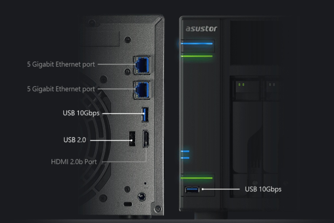Asustor AS6702T v2 kommer med bland annat dubbla 5 gigabits portar, dubbla USB3.2 anslutningar samt en HDMI port för direktanslutning av skärm eller TV.