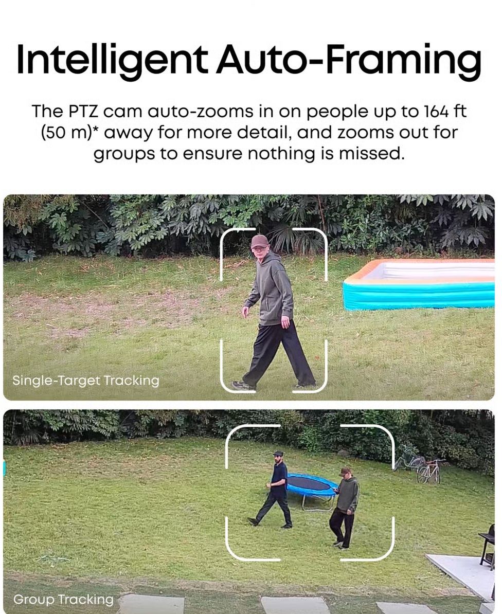 Två funktioner som fungerar riktigt bra när det kommer till spårning är dels auoframing som snabbt zoomar in eller ut baserat på om kameran upptäcker en eller flera individer, dels gruppspårningen som gör det möjligt att följa flera personer simultant i en enhet. Det enda egentliga problem som vi har synpunkter på och som vi hade hoppats att AI integrationen skulle löst är spårning som omfattar sekretesszoner. För med ”svartlistade” (privacy zones) områden aktiverade så får dessa vissa gånger eftersläpningar eller direkta del när PTZ spårning används vilket kan göra att vi får med områden som vi egentligen inte borde filma så som grannar.