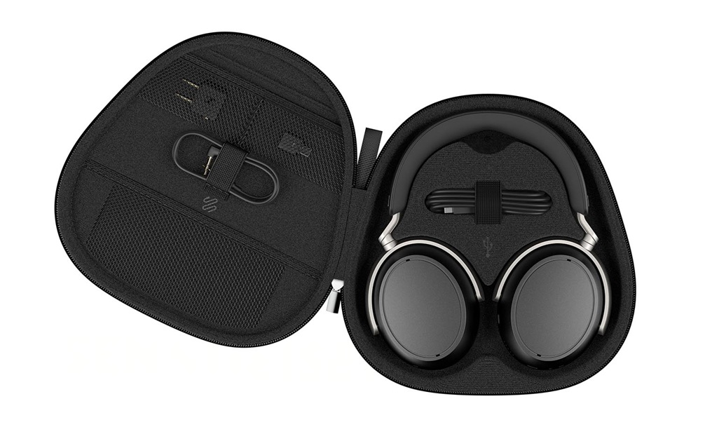 Som nämnts ovan så kommer lurarna med ett snyggt rese-/transportfodral som i färger matchar lurarna då även det är svart med Sennheisers logga mitt på. Till detta så medföljer även 1,2 meters USB-C-till-USB-C digital ljud- och laddningskabel, en likaledes 1,2 meters 3,5 millimeters kabel som ger möjlighet till klassisk analog anslutning och som dessutom kompletteras med en klassisk flygplansadapter.